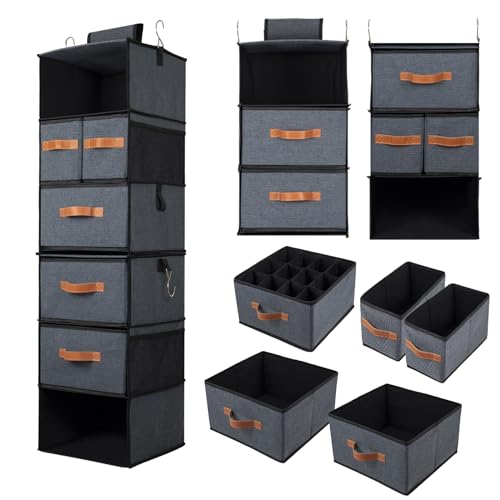 BrilliantJo Hanging Wardrobe Organiser 6 Shelves with 1 Removable Drawers Flexible 1 Split into 2(2X3 shelf) Closet Storage, hanging Shelves Unit with 4 Pockets for Clothes - Grey(12x 12 x 43.3 inch)