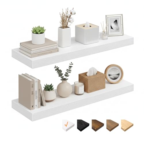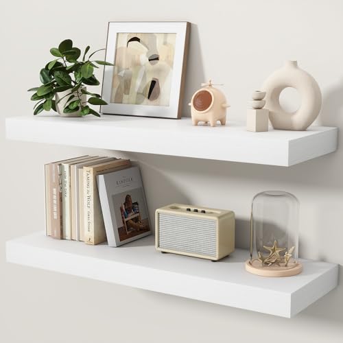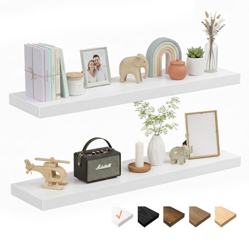 RICHER HOUSE Floating Shelves, 100cm Wall Shelves, Wooden Shelves for Wall with Invisible Brackets, Bookshelf Set of 2 for Bathroom, Bedroom, Office, Living Room,Kitchen (White, 100 x 23.5 x 3.8 cm)