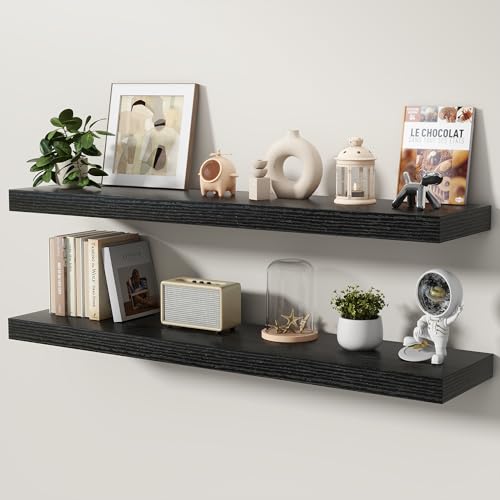 MITREL T Shaped-24 Inch Floating Shelves for Wall, Set of 2 Solid Pine Wood Shelves with Invisible Brackets, Wall Storage for Living Room, Bedroom, Kitchen, Bathroom(Black)