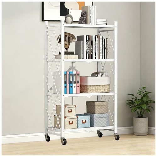 Foldable Storage Shelves with Wheels, Folding Shelving Units Storage, Heavy Duty Metal Collapsible Shelf No Assembly, Large Capacity Pop-Up Organizer for Garage,Kitchen,White,4 Tier