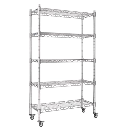 AIRAJ Shelving Unit,5 Tier Wire Storage Shelves with Wheels,Garage Shelving Units,Storage Shelving with Adjustable Leveling Feet,800kg Metal Shelving Unit,for Kitchen,Garage,Pantry, 91W×36D×186H CM