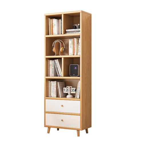 Wood Bookcase, Narrow Bookshelf Display Rack, Modern Corner Shelving Unit with 2 Drawers, Storage Cabinet for Living Room, Home Office Organization