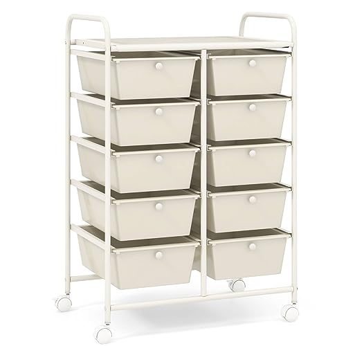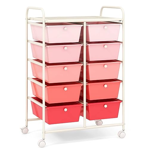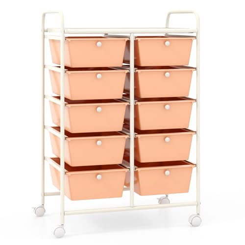COSTWAY 10 Drawers Storage Cart, Multipurpose Mobile Organizer Shelving Unit with Handle, Removable Drawers & Lockable Wheels, Utility Rolling Trolley for Home Office Beauty (Macaron)
