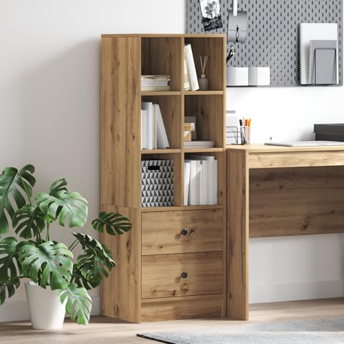 HaoChrymec Shelving Unit with Drawers, Engineered Wood Bookcase, 8 Open Shelves and 2 Storage Drawers, Sideboard Storage Cabinet for Living Room, Kitchen Cupboard Organiser, Artisan Oak Brown