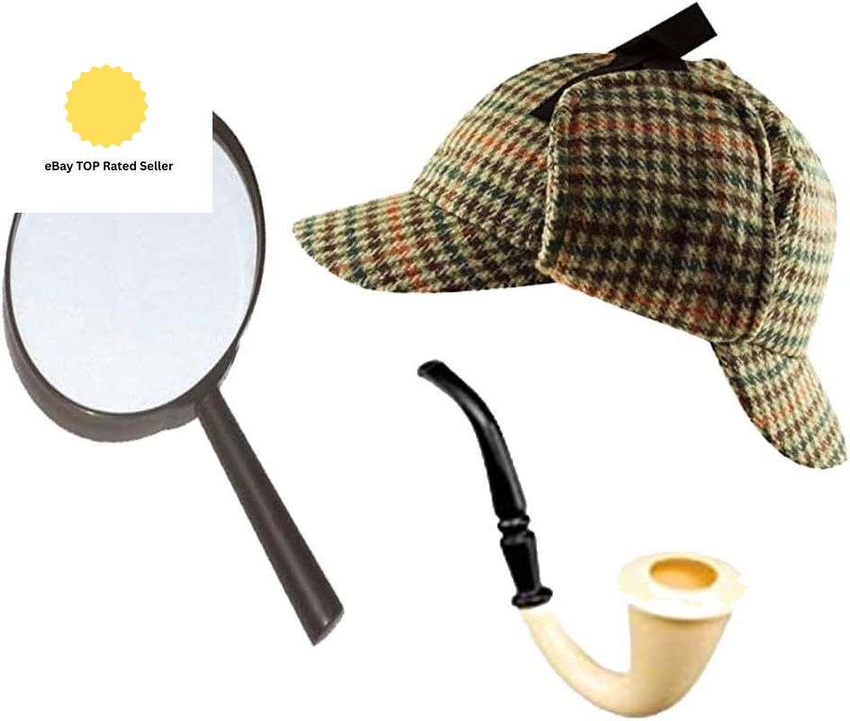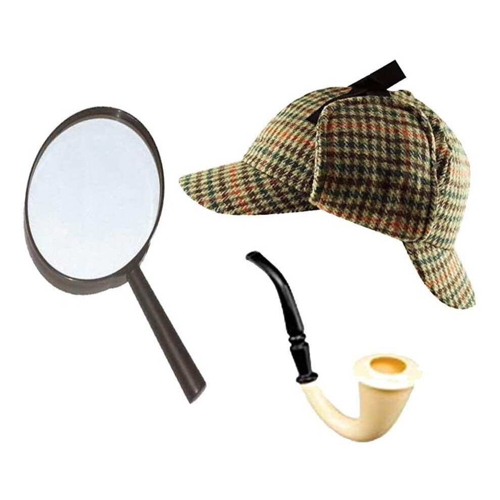 Sherlock Holmes Fancy Dress 3pc Accessory Set Deerstalker Hat + Magnifying Glass + Victorian Look Pipe Detective Kit