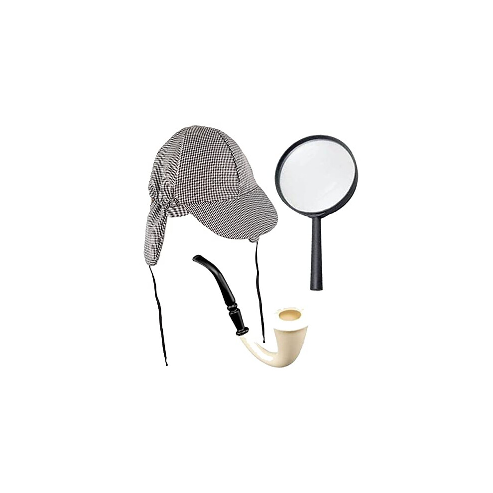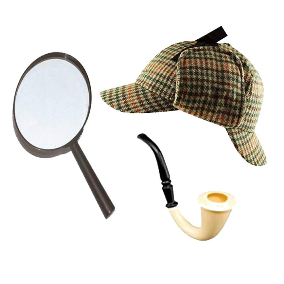 Sherlock Holmes Fancy Dress Accessory Set Deerstalker Hat + Magnifying Glass + Victorian Look Pipe Detective Kit