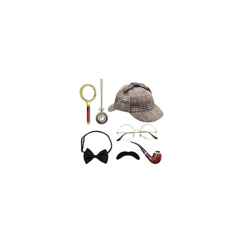 MFUOE 4 Pcs Detective Costume Set Deerstalker Hat Magnifying Glass Pipe Victorian Sherlock Holmes Fancy Dress Accessory for Halloween Costume Party Accessories