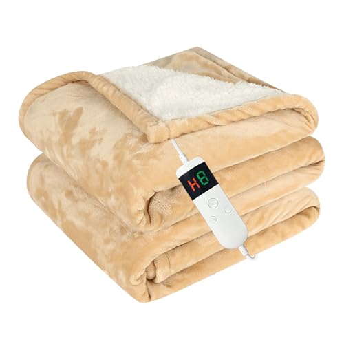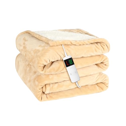 PROALLER Heated Blanket, Electric heated throw 160x130CM Beige, 10 Levels &1-9H Timer Auto-Off, Machine Washable, Soft Flannel Sherpa and Full Body Warming, Sofa Bed Office Use, warm blanket, electric