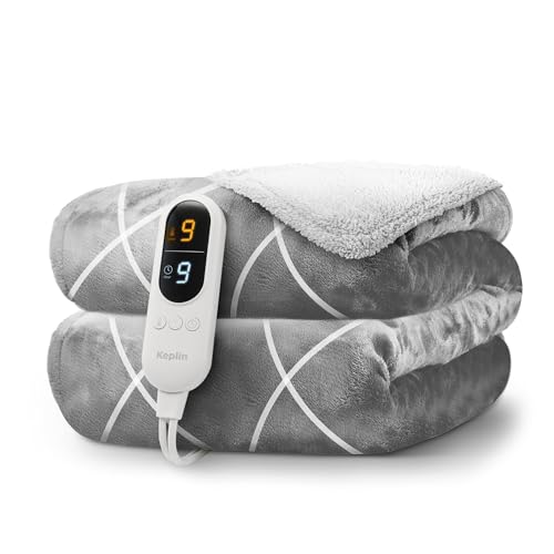KEPLIN Large Electric Heated Throw Blanket - Electric Heated Blanket Throw for Bedspread 9 Heat Settings & Timer, Machine Washable Fleece Wool Duvet with 1 Year Warranty - Light Grey & Cream Sherpa