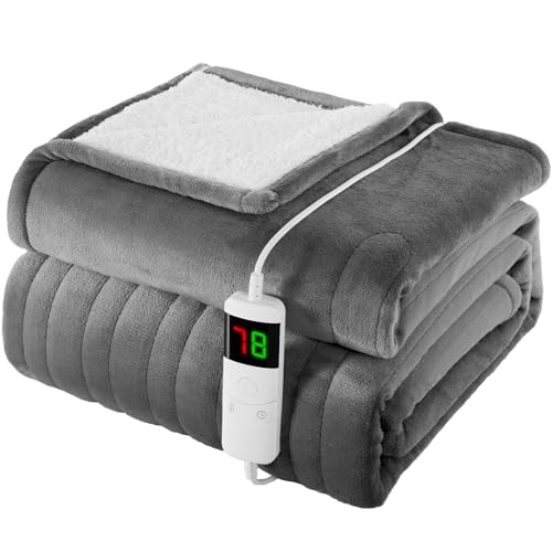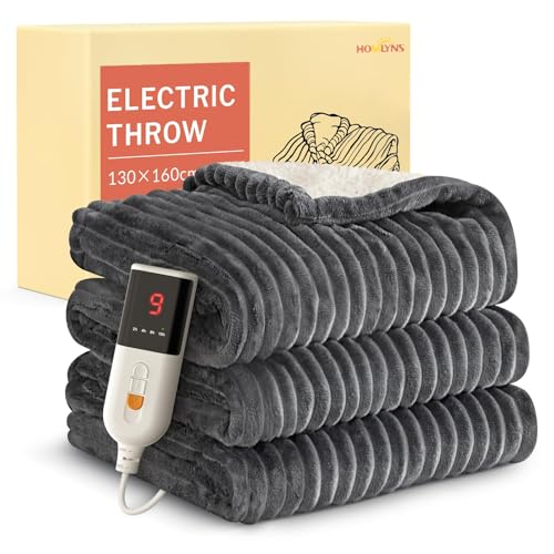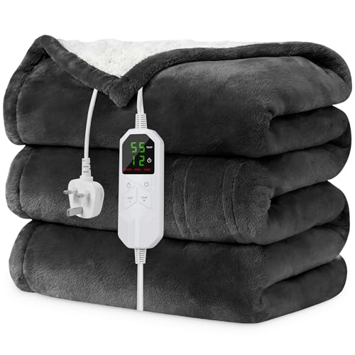 HOMLYNS Electric Heated Blanket Throw, 160 x 130cm Cozy Soft Flannel & Sherpa Heating Blankets with 9 Fast Heat Levels & 2-10 Hours Timer, Warm Gifts for Women Mom Grandma, UKCA Certified, Grey