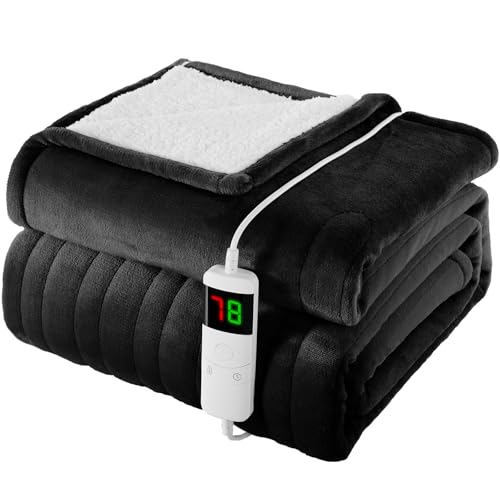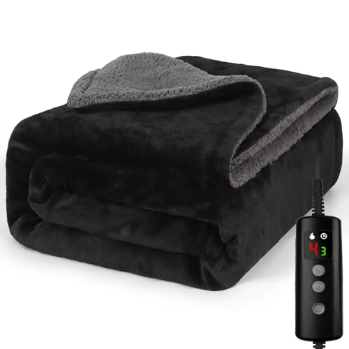 Bedsure Electric Blanket Heated Throw - 6 Heat Levels & 10 Timer Settings, Ultra-Soft Flannel & Sherpa Fast Heating Throw, 130x160cm, Overheat Protection, Black