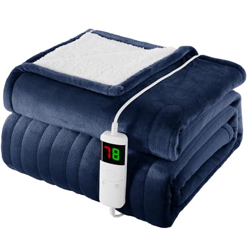 Bedsure Electric Blanket Heated Throw - 6 Heat Levels & 10 Timer Settings, Ultra-Soft Flannel & Sherpa Fast Heating Throw, 130x160cm, Overheat Protection, Navy Blue