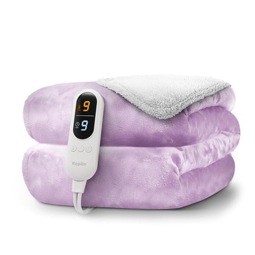 KEPLIN Large Electric Heated Throw Blanket - Electric Heated Blanket Throw for Bedspread 9 Heat Settings & Timer, Machine Washable Fleece Wool Duvet with 1 Year Warranty - Lilac/Cream Sherpa
