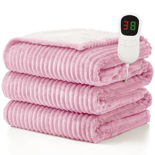Homemate Electric Blanket Heated Throw - 130x160cm, 1/2/4/6/8 Hours Auto-Off 10 Heat Levels Over-Heat Protection Soft Flannel Sherpa Washable Blanket Pink