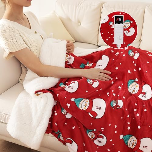 Centhermy Electric Heated Blanket 130x180cm Flannel Sherpa Throw with Christmas Snowman 9 Heat Settings & 9H Timer Soft & Warm Ideal for Winter