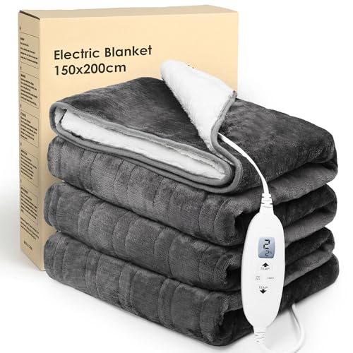 Cushious Heated Electric Blanket Throw 150x200cm, 10 Settings Heating,1-8h Timer Auto-Off, Overheat Protection, Machine Washable, Flannel and Sherpa Heated Blanket for Sofa Bed, Office