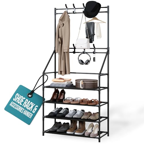 Klass Home Collection 4-Tier Shoe Rack & lightweight Coat Stand, Multipurpose Shoe Storage Organiser with 2 Hanging Rails & 8 Hooks, Hallway Organiser for Shoes & Accessories Storage Rack (Black)