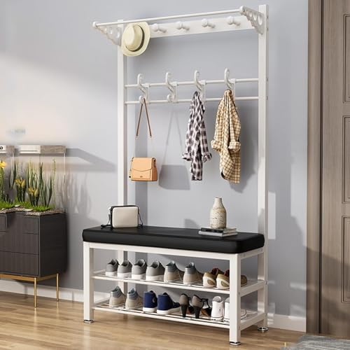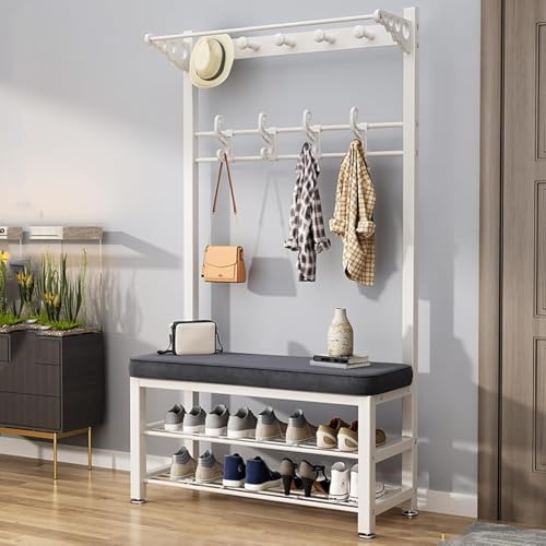 Shoe rack stool Freestanding Hall Tree Shoe Bench Rack with Coat Rack and Storage Shelf White Heavy Duty Steel Frame Entryway nizer