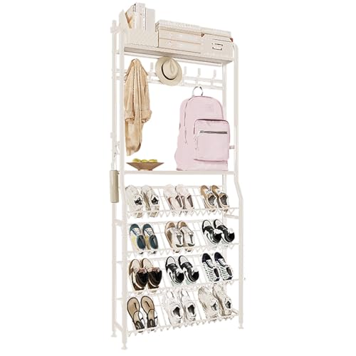4 Tier Shoe Rack with Hooks, Coat Rack and Practical Hooks for Bedroom, Hallway, Office Entryway Coat Rack with 8 Hooks 60cm,white