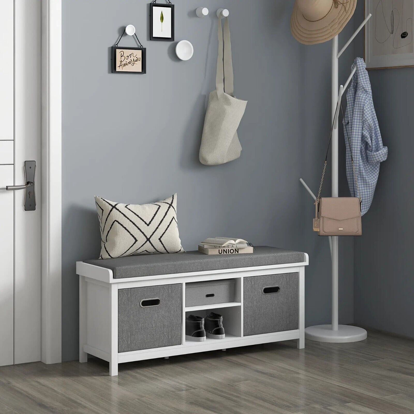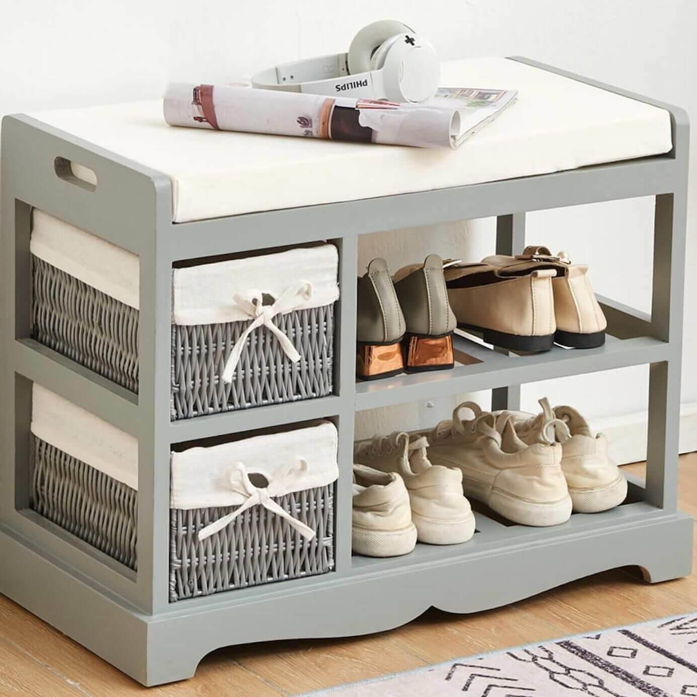 Grey Padded Shoe Storage Bench for Entryway