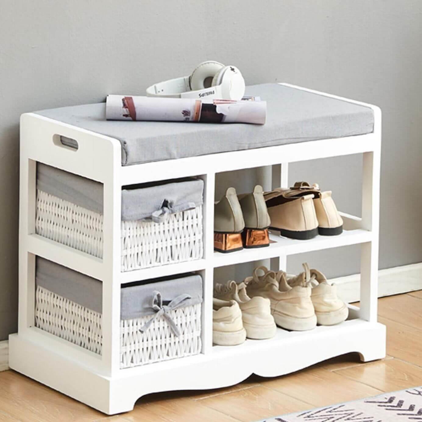White Padded Shoe Storage Bench for Entryway