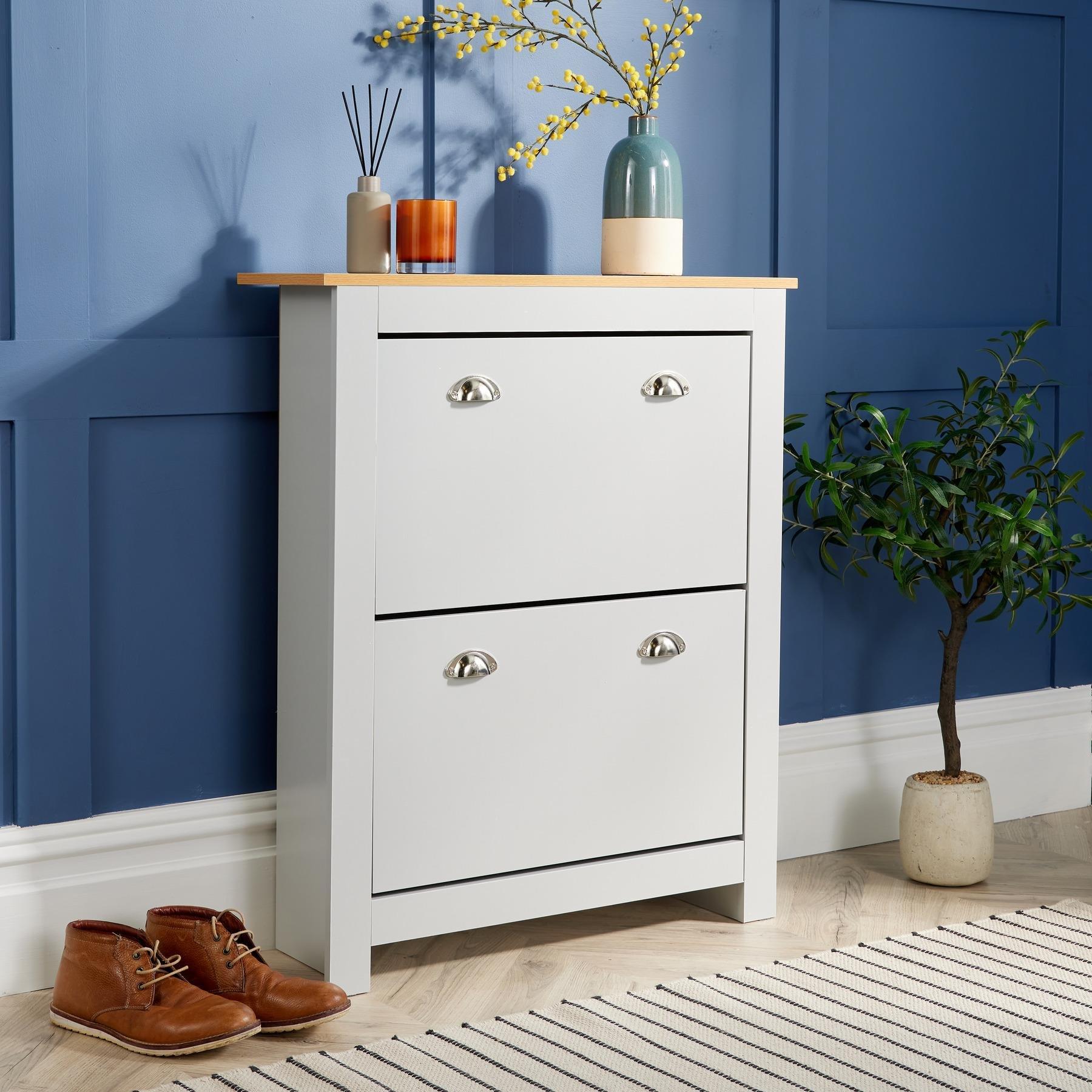 Blisswood 2 Drawer Shoe Cabinet, Wooden Shoe Storage Organiser Cupboard Unit Hallway Furniture, freestanding Entryway 2 tier Modern Shoes Rack Cabinet Footwear Stand for Shoes (Light Grey)