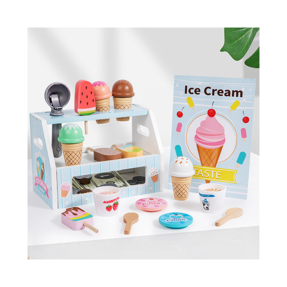 (Blue) Ice Wooden Cream Shop Cashier Children Toys Set For Kids Role Pretend Play