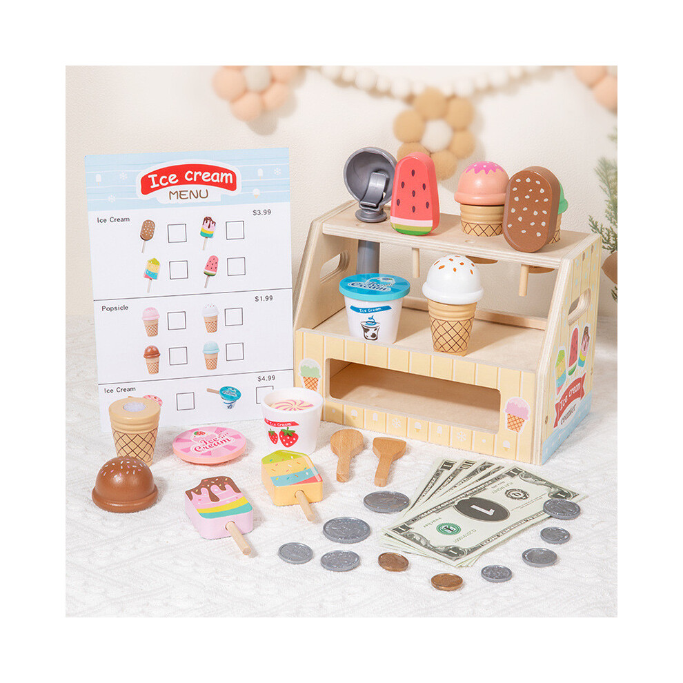 (Natural Wood) Ice Wooden Cream Shop Cashier Children Toys Set For Kids Role Pretend Play