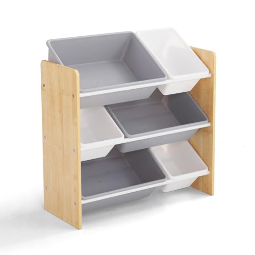 Kidoz Wooden Toy Storage Unit with 6x Removable Toy Boxes - Children's Toy Organiser, 3 Shelves - 2 Sizes of Storage Bins for Toys & Books - Ideal for Bedroom, Nursery or Playroom (Natural Wood)