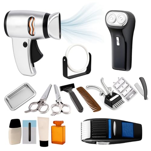 Coo11 Kids Barber Shop Play Set, Hair Salon Pretend Play Kit with Manual Hairdryer, Trimmer and Cutting Accessories, Educational Hairdresser Role Play Toy for Ages 3+