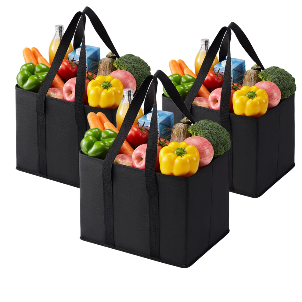 VENO 3 Pack Reusable Shopping Trolley Bags Set, Heavy Duty Collapsible Grocery Box Bag with Reinforced Bottom, Folding Tote Bag Storage Bins (Black -