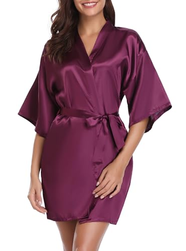 Vlazom Womens Kimono Robes Dressing Gown Satin Bathrobe Nightdress Short Style Bridal Robe with Oblique V-Neck (Dark Purple, S(UK 6))