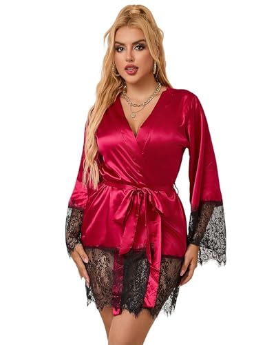 ohyeahlady Plus Size Lingerie,Satin Dressing Gown,Womens Short Lace Trim Bridal Robe,Ladies Kimono Babydoll Nightwear with Belt and G-String Red Size 20-22