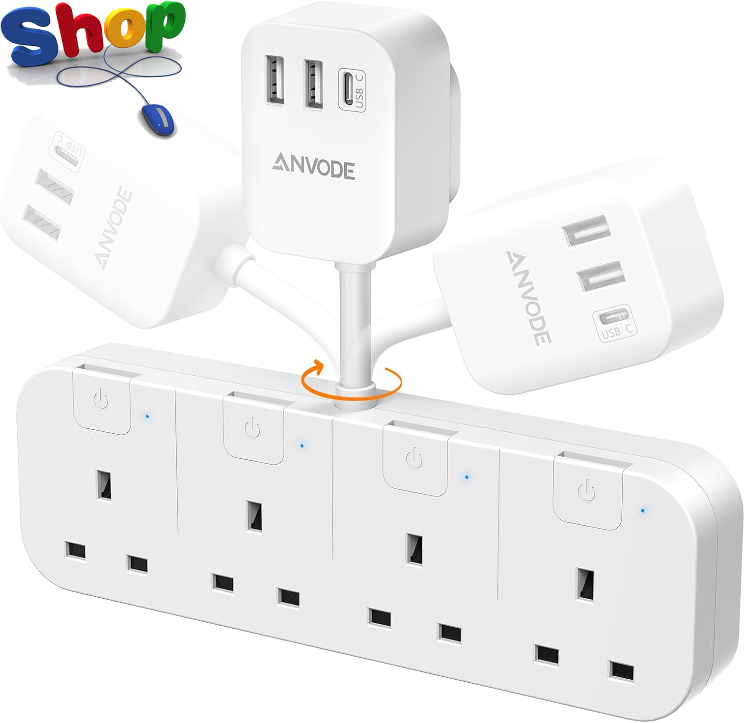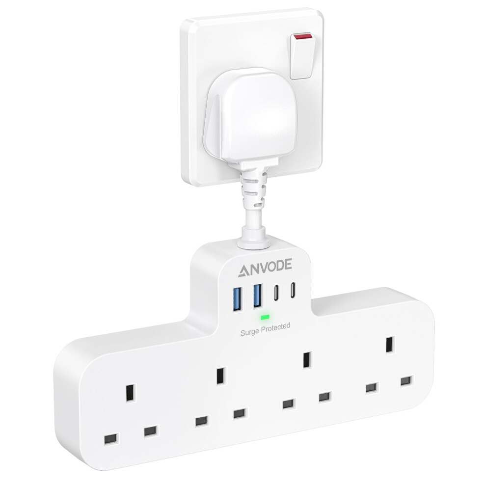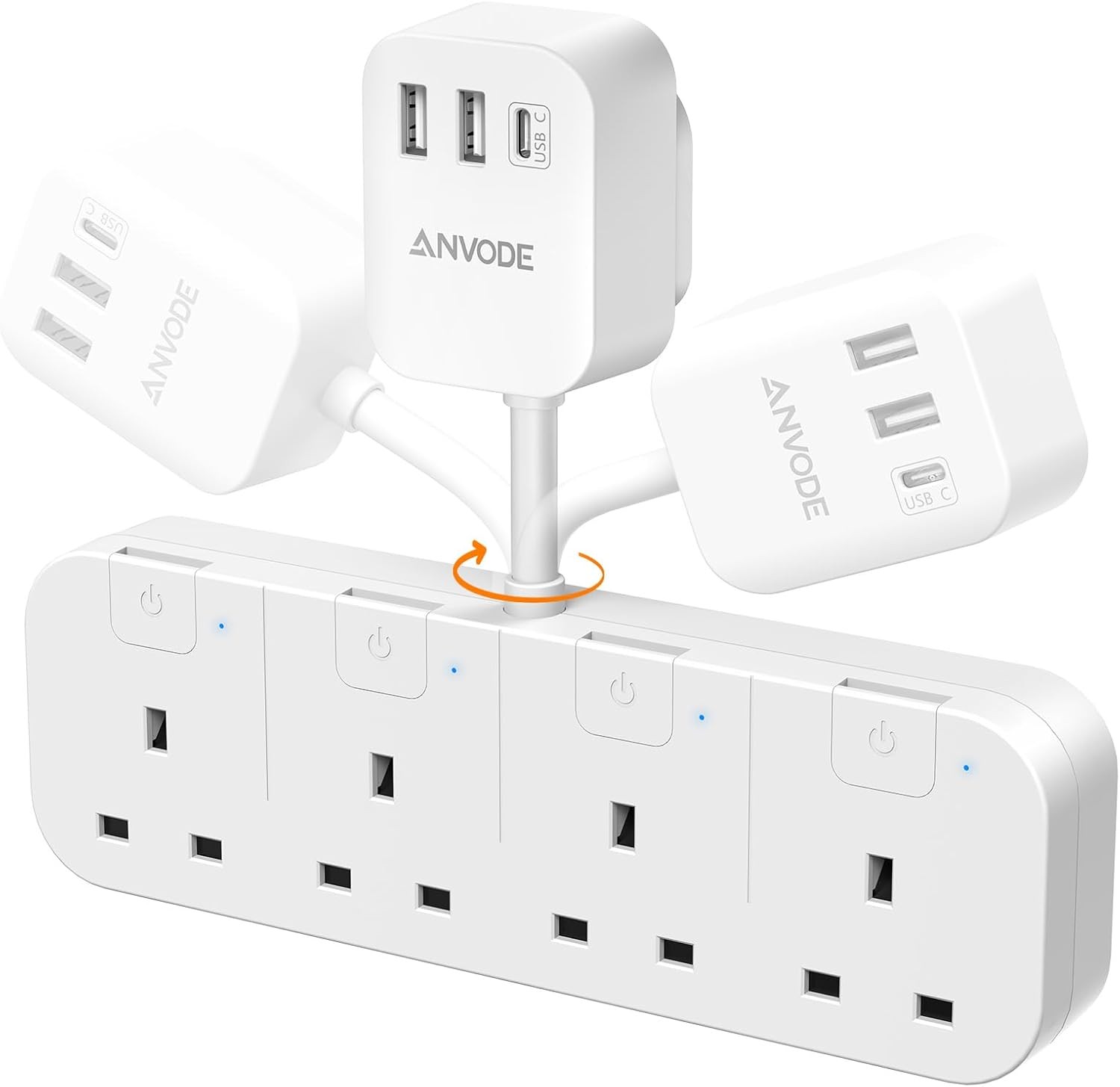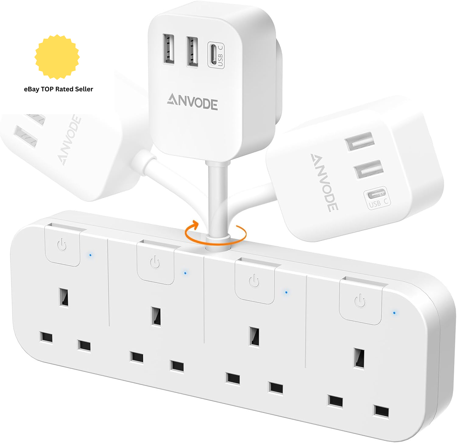Multi Plug Extension Socket with 4 USB (2 Type C), ANVODE 4 Way Plug Adaptor with Short Cable, Adapter Plug UK Turn 1 to 8, Short Extension Lead Power