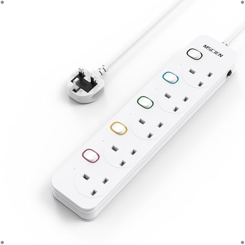 Mscien Short Extension Lead 1M 5 Way Wall Mounted, 1M Extension Lead 5 Gang Switched with Multiple Protection, Fused Power Strip with Indicator Light, Suitable for Home, Office and Kitchen, 13A/3250W