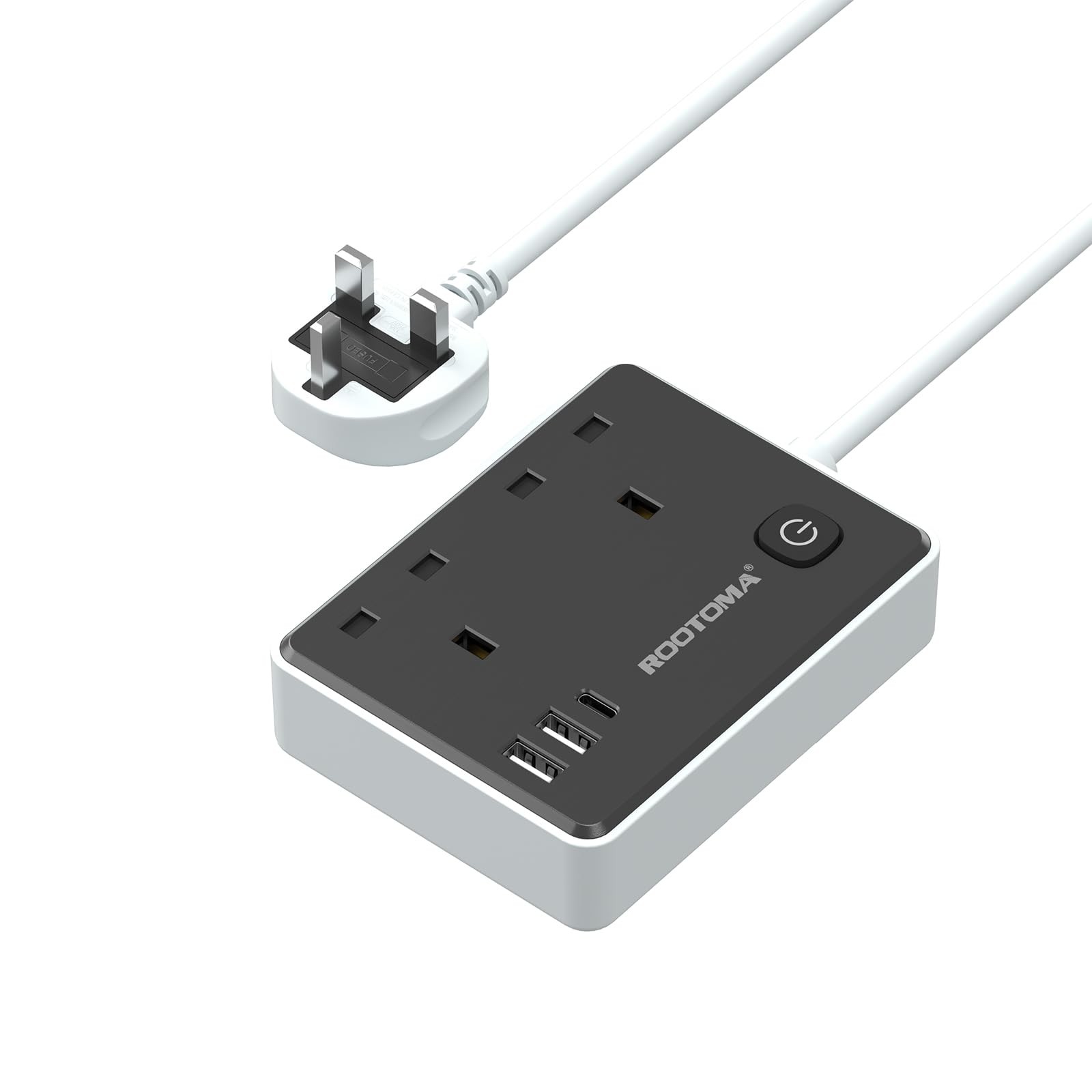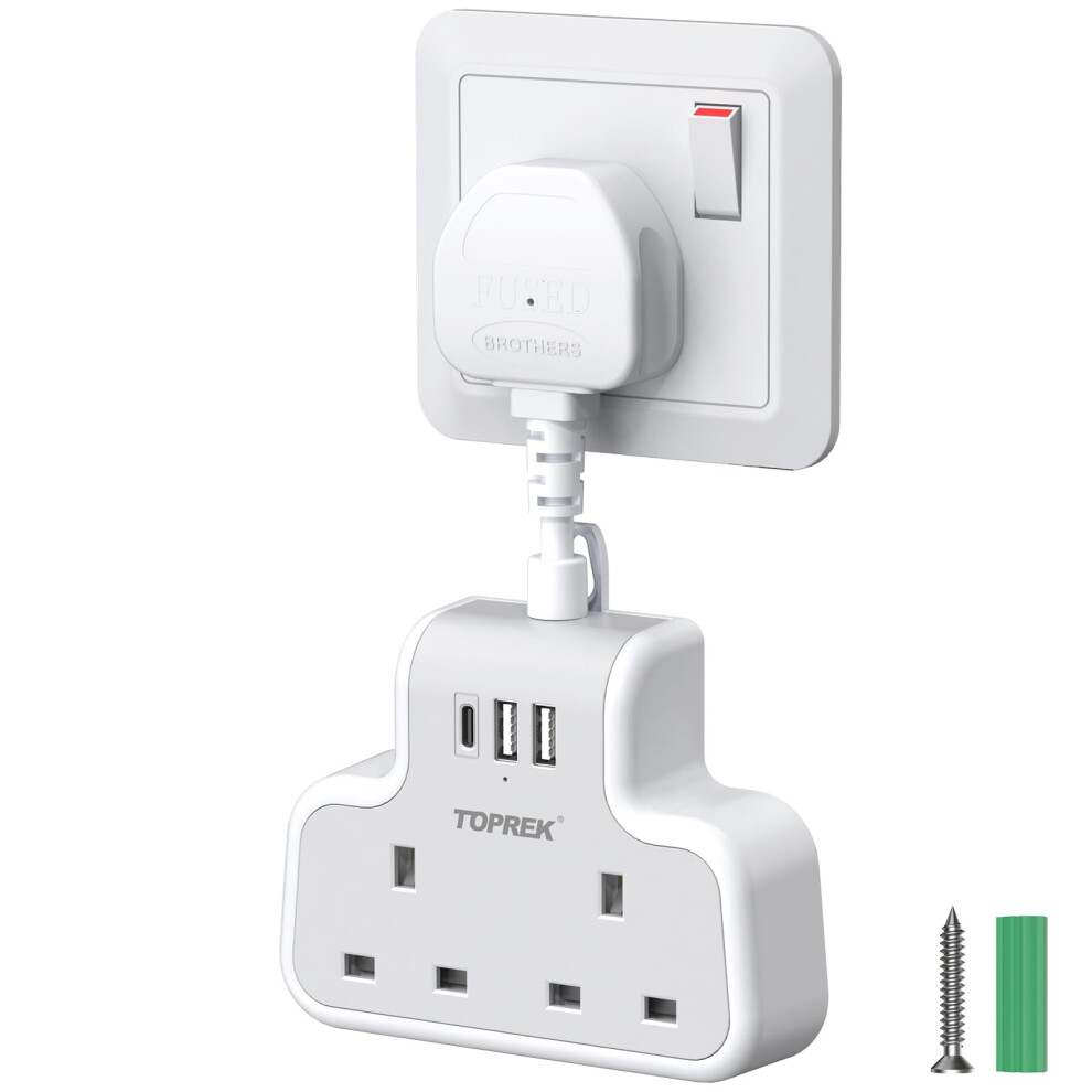 TOPREK Multi Plug Extension Socket with USB C, 6.2cm Short Extension Lead, Double Plug Sockets Compact Wall-Mounted Plug UK for Home, Office, Kitchen