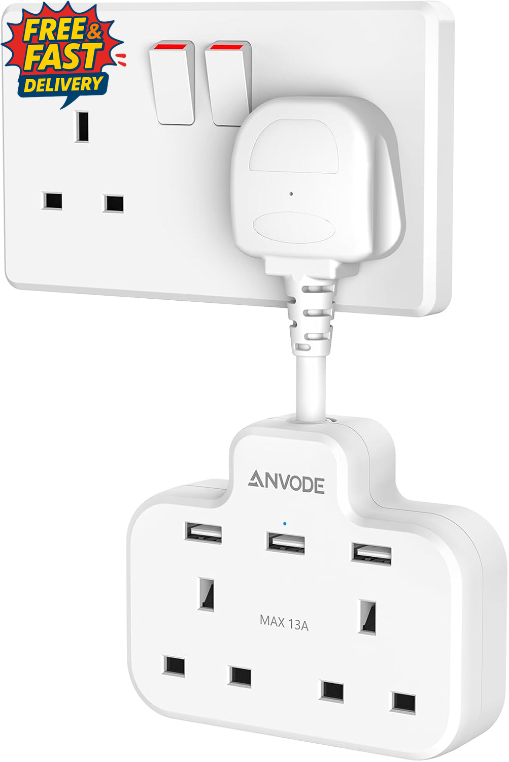 Multi Plug Extension Socket with 4 USB Ports, ANVODE 2 Way Plug Adaptor with Flexible Cable, Short Extension Lead Double Adapter Plug UK for Bedroom, Office, Kitchen. White