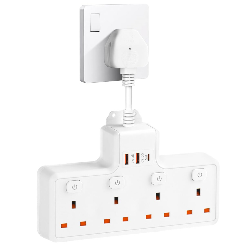 4 Way Plug Adapter with USB C, 4 Gang Small Short Extension Lead with Independent Switches, Multi Wall Socket UK Power Strip for Home, Kitchen (White