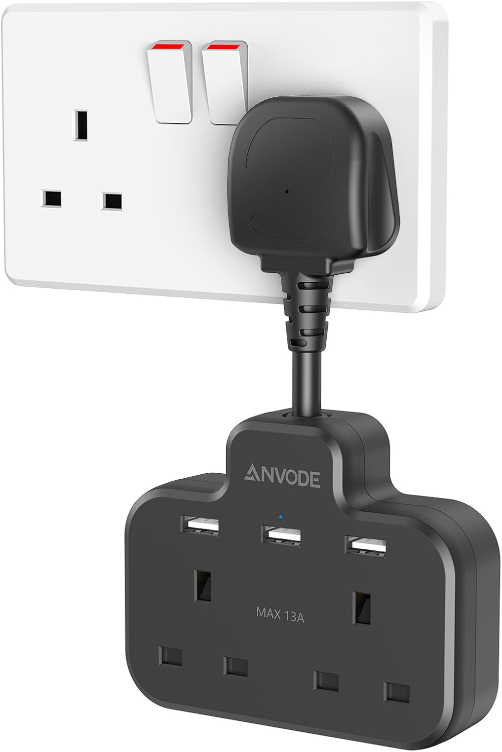 Multi Plug Extension Socket with 4 USB Ports, ANVODE 2 Way Plug Adaptor with Flexible Cable, Short Extension Lead Double Adapter Plug UK for Bedroom,