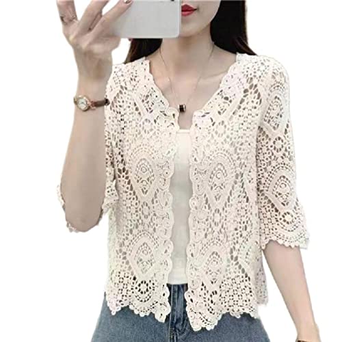 Women Summer Knitted Lace Shrug Boho Hollow Crochet Floral 3/4 Sleeves Open Front Cropped Cardigan Elegant Short Mesh Sweater Cover Up Outwear cotton kimono cardigans batwing sleeve solid colors