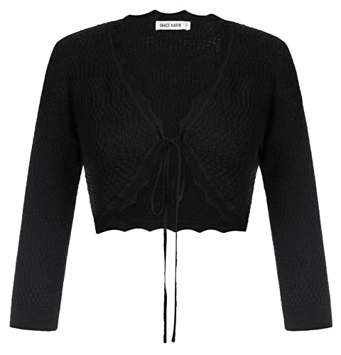 GRACE KARIN Women’s Summer Tie Front Short Cardigan Knit 3/4 Sleeve Cardigan Bolero Shrug Sweater Lightweight Black M