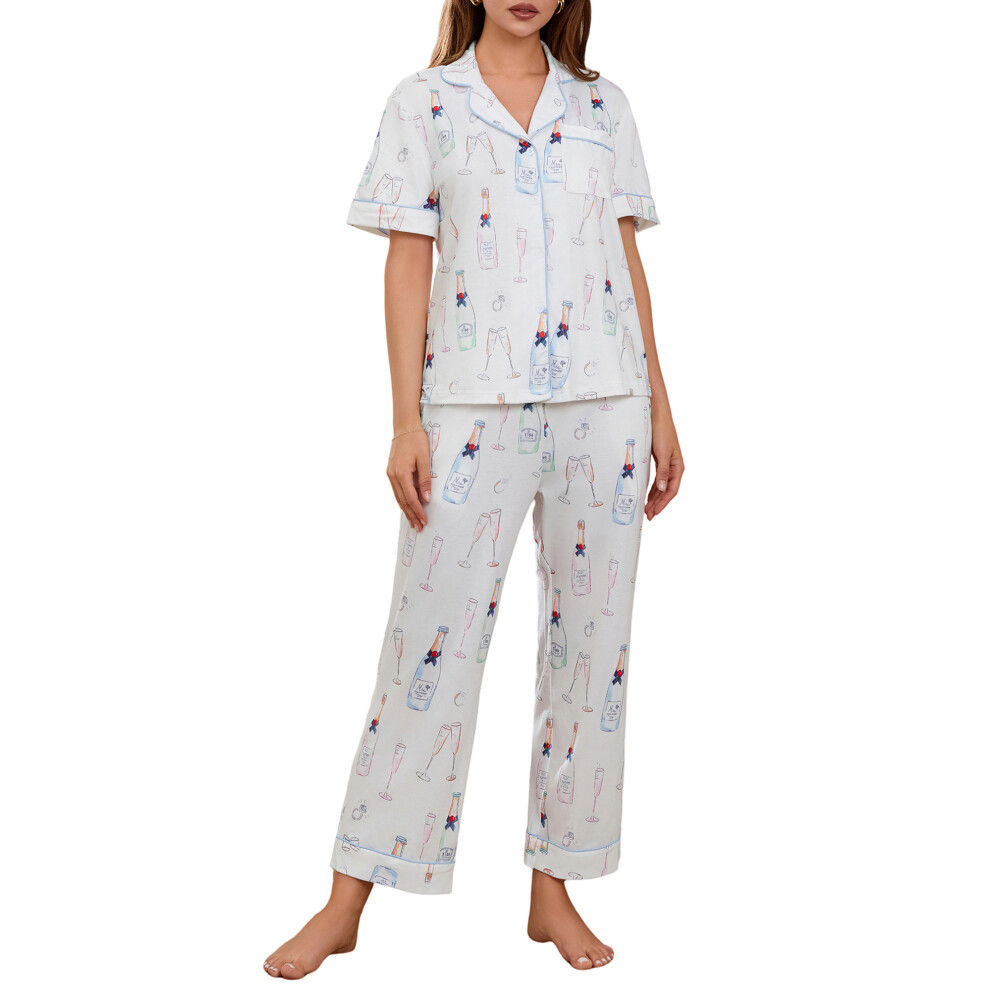 (M, White) Women Pajamas Set 2 Pieces Loungewear Suits Wine Glasses Print Short Sleeve Loose Tops and Elastic Waist Pants Sleepwear Outfits