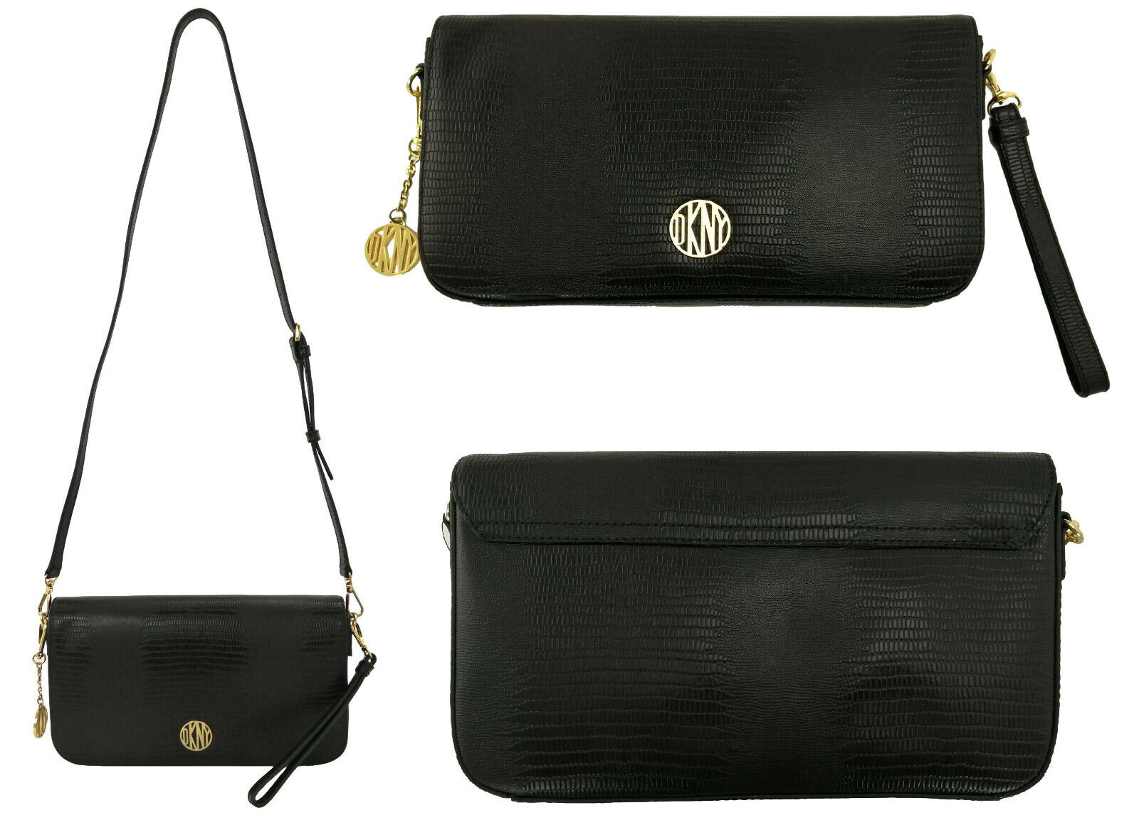 DKNY Black Crossbody Bag Shoulder Medium Lizard Print Embossed Leather RRP £200