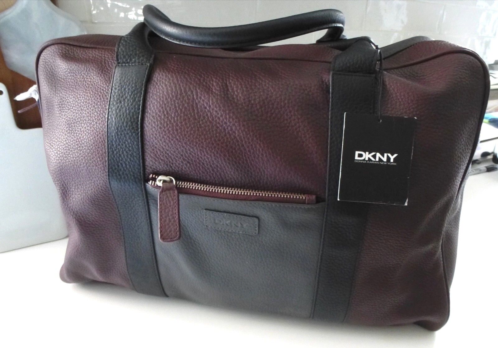 New DKNY LEATHER Black Cherry Anthracite Black Holdall Shoulder Bag Travel Tags