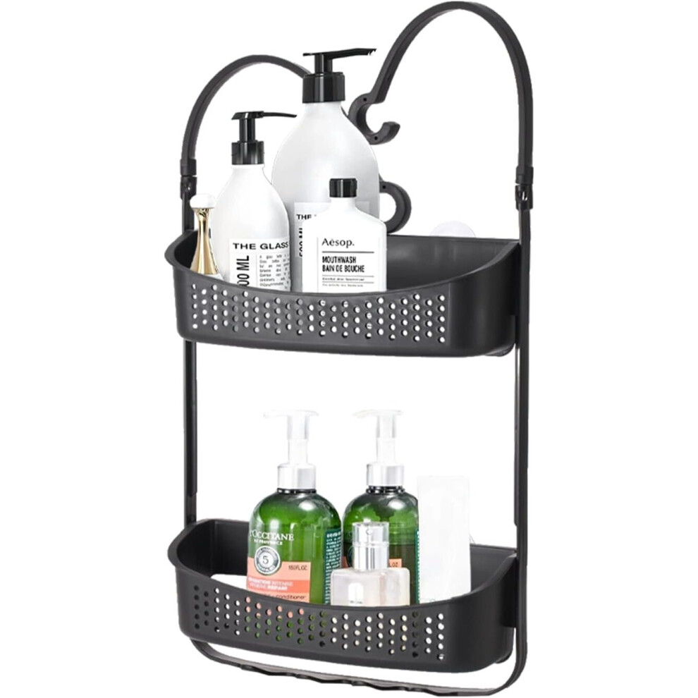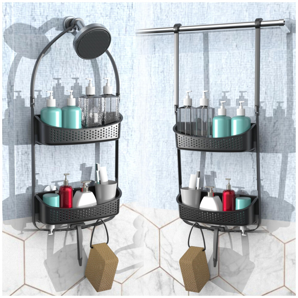 Bathroom Shower Caddy 2 Tier Rack Shelf Hanging hooks BLACK Plastic