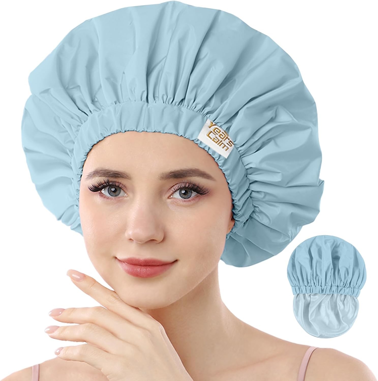 Years calm Reusable Waterproof Shower Caps for Women, Hair Caps for Showers, Double-Layer Elastic Design, for All Hairstyles, Travel-Friendly (Sky Blue)