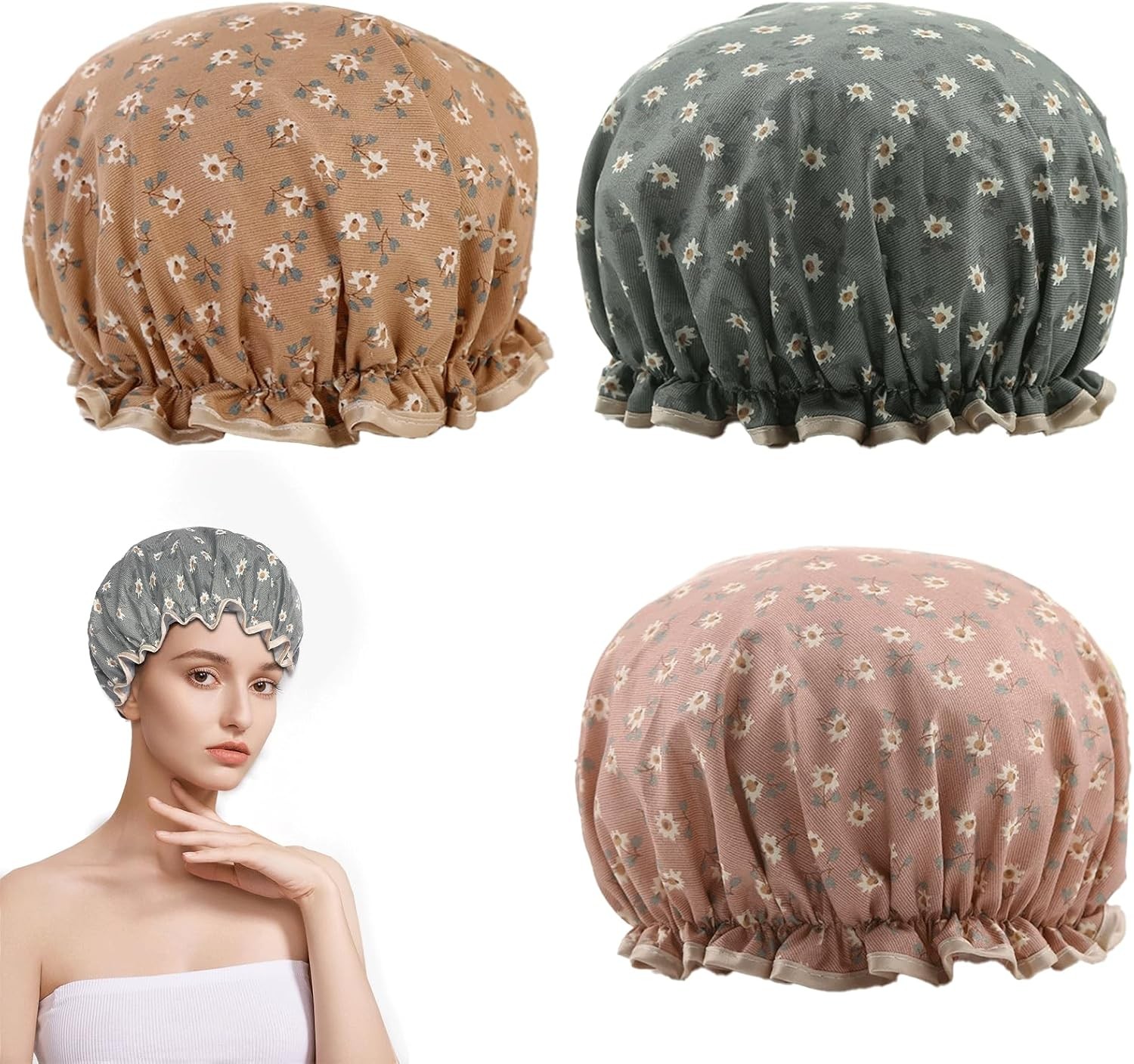 3 Pcs Double Layer Shower Caps for Women,Reusable Bath Caps Waterproof Shower H