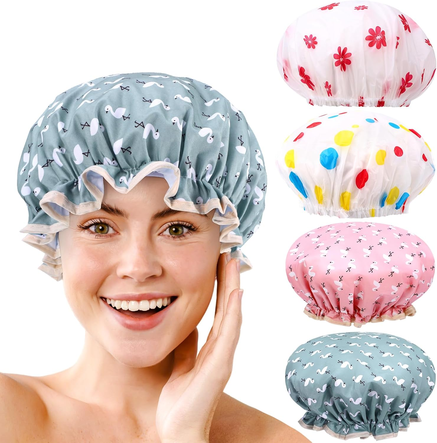 4 Pack Shower Caps for Women, Waterproof Reusable Bath Cap for Women, Double Lay