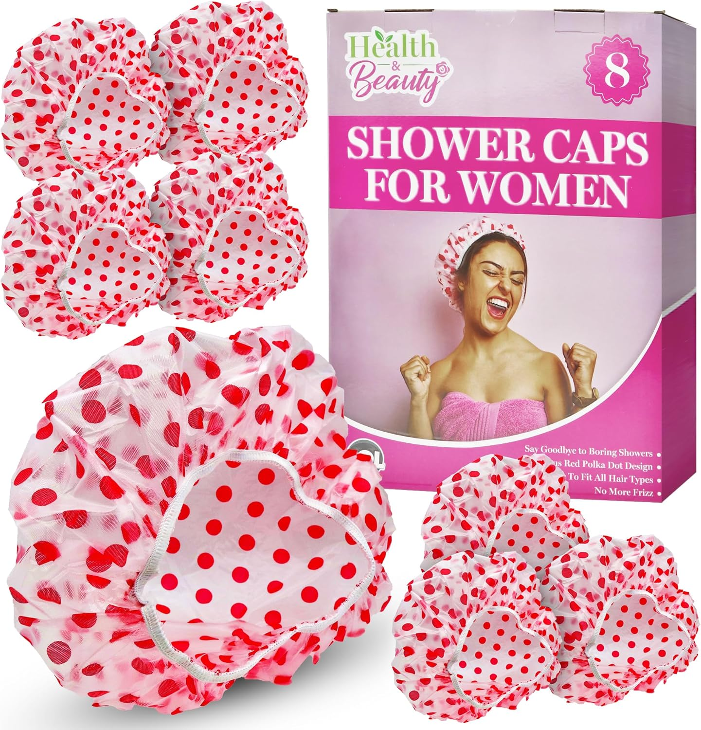 8Pk Shower Caps for Women UK, Red Polka Dot Design, Waterproof Reusable & Large