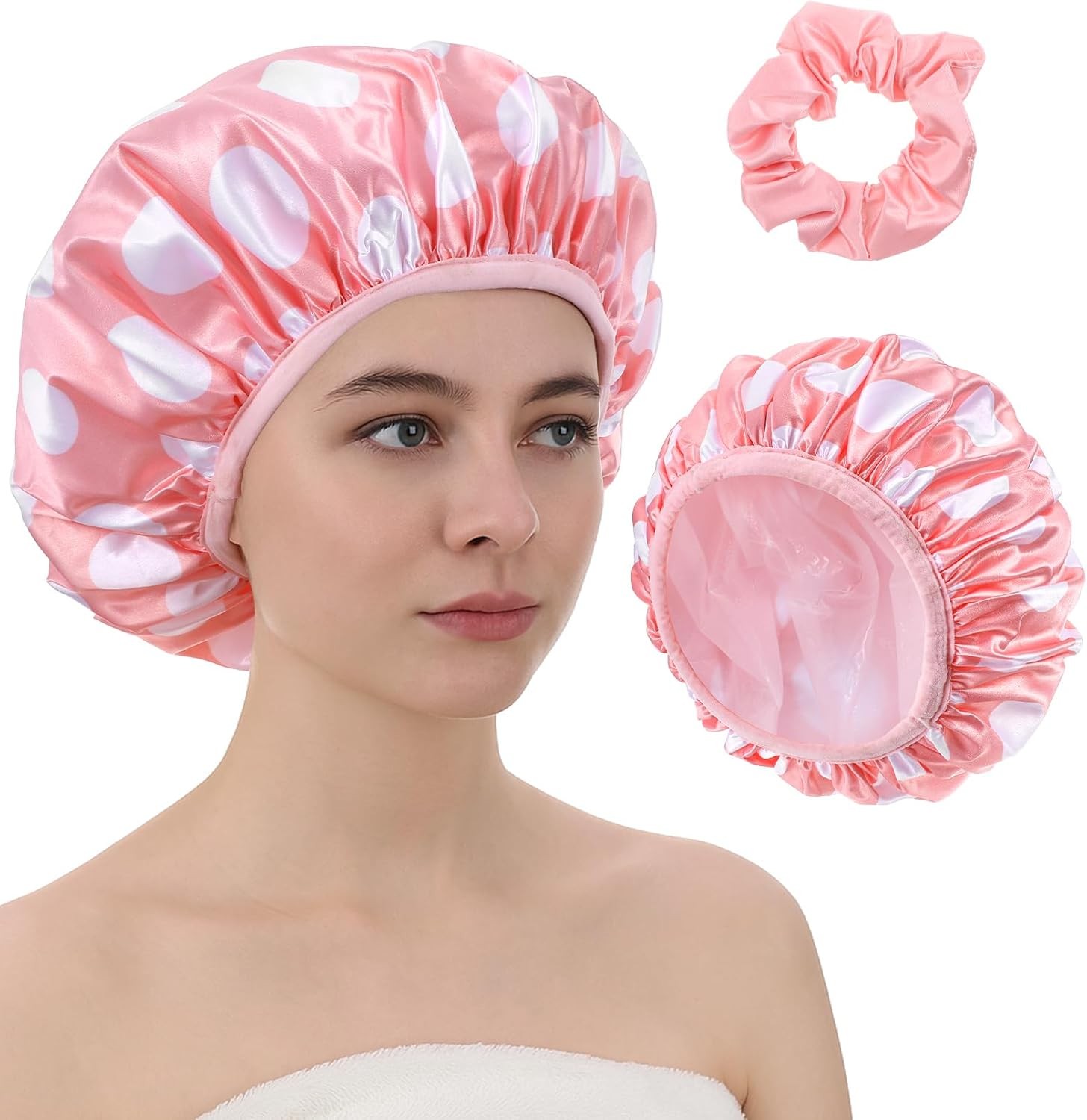 Pink Shower Cap, Pink Large Reusable Waterproof Shower Caps for Women UK Reusab